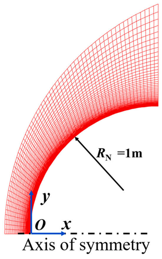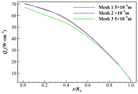 This study employs PHAROS to simulate hypersonic flows over a standard sphere with a radius of R = 1 m. The freestream conditions correspond to the Apollo-4 trajectory [53], as listed in Table 1, where H denotes the flight altitude, and V∞, Re, and Ma represent the flight velocity, Reynolds number, and Mach number. T∞, p∞, and ρ∞ are the freestream temperature, pressure, and density, respectively. The wall temperature is maintained at a constant value of Tw = 300 K. The freestream air is composed of nitrogen and oxygen, with mass fractions of YN2 = 0.77 and YO2 = 0.23. Both super-catalytic wall (scw) and non-catalytic wall (ncw) conditions are simulated. The mesh dimensions are 61 × 121 (circumferential × radial), as depicted in Figure 4. Since the wall heat flux is highly sensitive to the grid configuration, we selected different wall grid thicknesses of 5 × 10−5 m, 1 × 10−5 m, and 5 × 10−6 m to compute the flow field at Ma = 16.92. The resulting wall heat fluxes are shown in Figure 5. The stagnation point heat flux was extracted to evaluate the deviation between different meshes. The deviation between Mesh 1 and Mesh 2 is less than 1%, while that between Mesh 2 and Mesh 3 is 4.6%. Therefore, the heat flux obtained using Mesh 2 is considered sufficiently accurate for the present study. The spacing of the first grid layer perpendicular to the wall is set to 1 × 10−5 m to ensure that the cell Reynolds number is less than 1 for all cases, which meets the requirements for reliable wall heat transfer prediction [54].