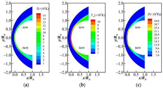Distributions of translational–rotational temperature (a), vibrational–electronic temperature (b), and pressure (c) at Ma = 30.37 under both super-catalytic wall (scw) and non-catalytic wall (ncw) conditions.