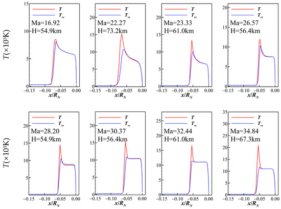 In this section, the key features of the hypersonic flow field over a spherical configuration are briefly analyzed based on the computed results. The results for Case 3, with a Mach number of Ma = 30.37, illustrate the characteristics of hypersonic reentry flow, which are consistent across other cases. Figure 6 presents the distributions of translational–rotational temperature, vibrational–electronic temperature, and pressure for both super-catalytic wall (scw) and non-catalytic wall (ncw) conditions at Ma = 30.37. A strong bow shock forms ahead of the sphere, causing sharp increases in temperature and pressure behind the shock. The shock standoff distance is minimal, approximately 1/15 of the sphere radius RN, resulting in a thin shock layer. Both super-catalytic and non-catalytic wall conditions have negligible effects on temperature and pressure distributions within the shock layer. For further analysis, Figure 7 depicts the temperature distribution along the stagnation line under the non-catalytic wall condition. Temperature peaks immediately behind the shock and then rapidly decreases downstream. Within the shock layer, the translational–rotational temperature is significantly higher than the vibrational–electronic temperature, indicating a remarkable thermodynamic nonequilibrium. This nonequilibrium effect is most prominent immediately behind the shock and transitions to equilibrium over a short distance. Comparing paired cases with different Mach numbers but the same altitude (Ma = 16.92 and 28.2, Ma = 23.33 and 32.44, Ma = 26.57 and 30.37), it is evident that nonequilibrium effects intensify with increasing Mach number, as expected.