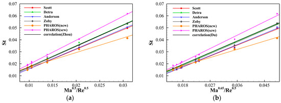 where Cp and κ are the specific heats at constant pressure and the ratio of specific heats of the freestream, respectively. All Stanton numbers are then correlated with the Mach and Reynolds numbers and compared with relations proposed by Zhou et al. [36] (Equation (34)) and Du et al. [37] (Equation (35)) as follows: