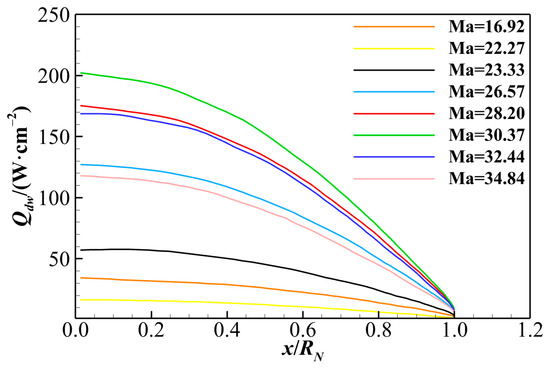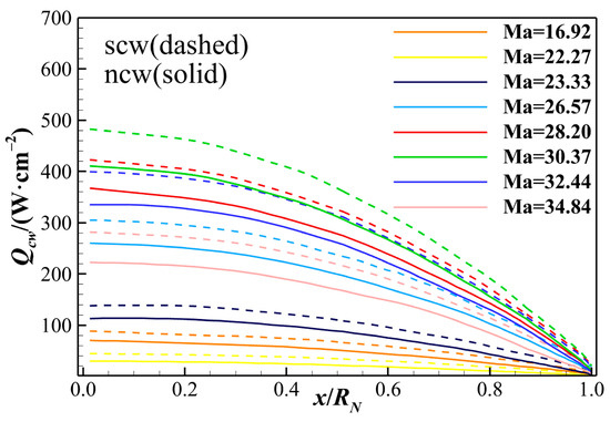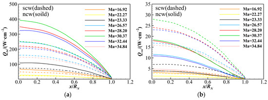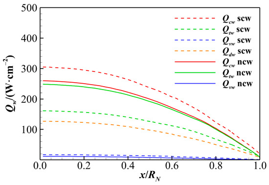 Wall catalysis significantly affects heat flux prediction. This section compares results under super-catalytic and non-catalytic wall conditions. The vehicle surface promotes the recombination of single-atom molecules or ions near the wall. For non-catalytic wall (ncw) conditions, the gradient of the wall species is set to zero, denoted by ∂Ys/∂y = 0. For super-catalytic wall (scw) conditions, the mass fraction of a single-atom species at the wall is set to zero, expressed as Ya = 0, allowing complete recombination reactions. To analyze the impact of super-catalytic and non-catalytic walls on wall heat flux, Figure 10 presents the distributions of wall heat fluxes under both catalytic boundary conditions for eight cases. The heat flux reaches its maximum at the stagnation point and gradually decreases along the wall. In this study, the maximum heat flux reaches 480 W/cm2 at Ma = 30.37. A comparison of the solid and dashed lines of the same color in Figure 10 reveals that the heat flux at the super-catalytic wall is significantly higher than at the non-catalytic wall across all cases, with a maximum discrepancy of 48.9%. This discrepancy is a significant source of uncertainty in aerodynamic heating predictions [55]. The heat transfer predictions for super-catalytic and non-catalytic walls are generally regarded as the upper and lower bounds of actual aerodynamic heating in hypersonic reentry vehicle design. Therefore, a deeper understanding of wall heat flux composition, including the influence of wall catalysis, is essential for accurately assessing the aerothermal environment in hypersonic reentry.