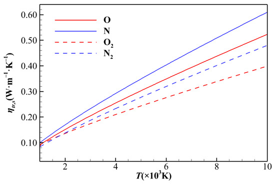 where As, Bs, and Cs are the fitting coefficients. Particularly, the translational–rotational temperature T in Equation (14) should be replaced by the vibrational–electronic temperature Tve for calculating the viscosity of free electron. Corresponding to the multiple internal energy modes for each species, the thermal conductivity is calculated using Eucken’s relation [13] as follows: