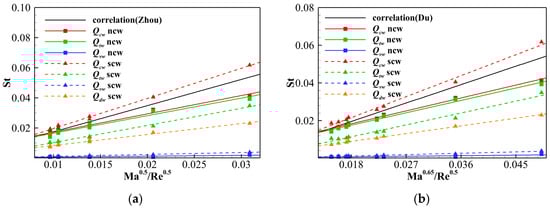 Stanton numbers of different heat transfer modes correlated with Ma and Re based on Zhou et al. [36] (a) and Du et al. [37] (b).