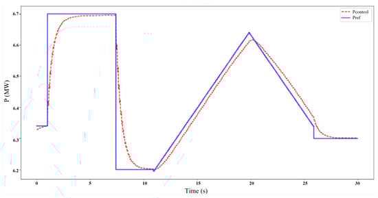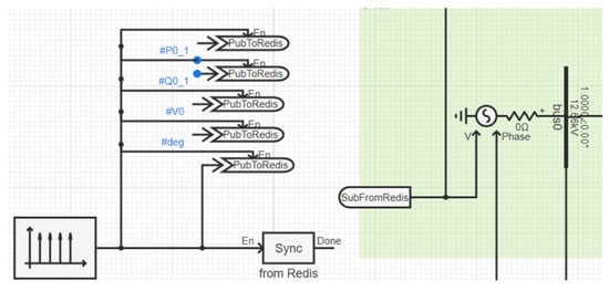 For online closed-loop testing, a co-simulation environment was established. The MPC controller was implemented as a Python script, running separately from the CloudPSS simulation engine. Communication between the Python controller and CloudPSS was facilitated by a Redis (Remote Dictionary Server) instance acting as a message broker. Specific CloudPSS components (Sync, PubToRedis, SubFromRedis) were configured to manage the simulation time steps and data exchange. The Sync component pauses the simulation at predefined intervals () and resumes it upon receiving a signal via Redis. The PubToRedis components publish measurements (P, Q, V, ) from the CloudPSS model to specific Redis channels. A SubFromRedis component subscribes to a Redis channel to receive the voltage setpoint computed by the Python controller, which is then fed to a controlled voltage source at the PCC in the CloudPSS model. This setup allows for pseudo-real-time interaction, testing the controller’s performance within a closed loop involving the detailed DN simulation. Figure 3 illustrates this interface.