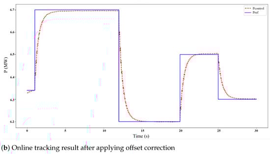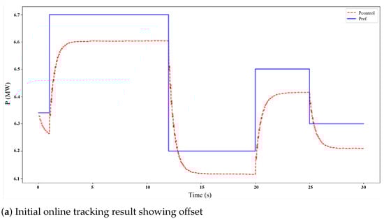 with the initial condition . The choice of Euler forward discretization is primarily driven by its computational simplicity, which is crucial for achieving a real-time performance within the MPC framework. While it is a first-order method, its suitability for the chosen control time step ( s) is supported by empirical observations from our simulations. For typical distribution network dynamics and control objectives focused on power regulation, a 0.1 s interval is sufficiently small to ensure numerical stability and an acceptable prediction accuracy over the short prediction horizon. The receding-horizon nature of MPC further enhances the robustness by continuously re-linearizing the model and re-solving the optimization problem at each step, thereby mitigating any potential accumulation of discretization errors.