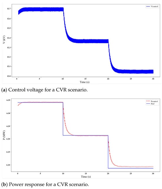 Power distribution networks (DNs) are undergoing a profound transformation, evolving from passive conduits delivering power unidirectionally to active systems integrating significant amounts of distributed energy resources (DERs), such as photovoltaic (PV) generation, and supplying increasingly complex loads, including to electric vehicles and power electronic devices [1]. This paradigm shift introduces bidirectional power flows, increased variability, and complex non-linear behaviors, significantly increasing the operational complexity of DNs [2]. Secure and stable operation of the power system faces substantial challenges due to the growing proportion of variable renewable energy generation [2]. To address this, control of the active power consumption within DNs, often achievable through voltage regulation at the point of common coupling (PCC), is becoming a critical strategy for ensuring supply–demand balance, enabling peak shaving, and improving the energy efficiency through initiatives like Conservation Voltage Reduction (CVR) [3,4].