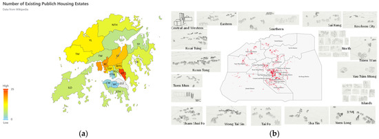 Number and models of public housing in 18 districts of Hong Kong. (a) Number of existing public housing estates. (b) Representative building morphologies of public housing estates across 18 districts.