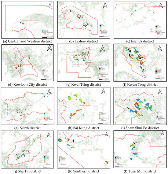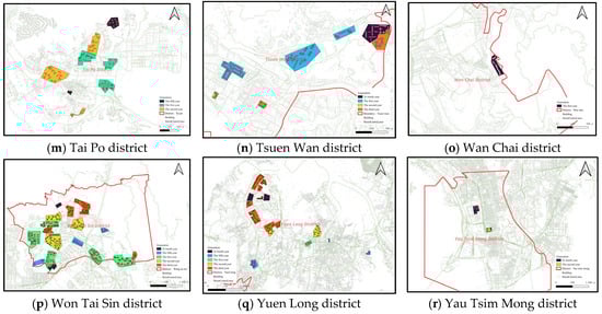 Spatial distribution of public housing estates from five different eras in 18 districts of Hong Kong; (a–r) represents different districts.