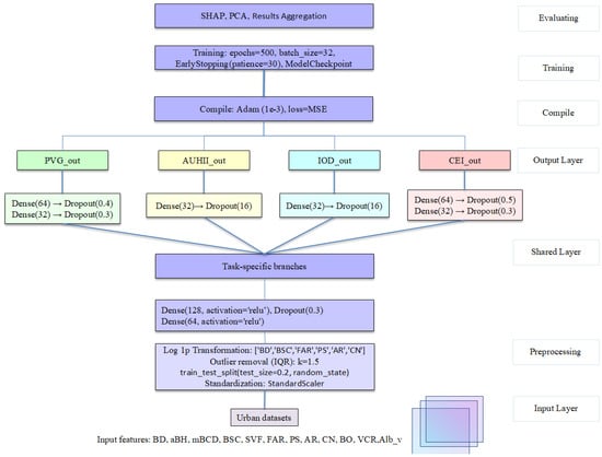 Drawing from the categorization of MTL architectures described by Meyer [53], this study develops an artificial neural network-based multi-task learning (ANN-MTL) model. The structure of the model is shown in Figure 3. The input layer accepts a tensor of shape (batch_size, 12), representing the 12 urban morphology features (BD, aBH, mBCD, BSC, SVF, FAR, PS, AR, CN, BO, VCR, Alb-v). Before model training, the input features were subjected to a standardized preprocessing pipeline with random-seed control for reproducibility, involving log1p transformation to stabilize variance, outlier removal using the interquartile range (IQR) method, and z-score normalization fitted on the training data and applied consistently to validation/test sets. The resulting feature vectors were then fed into a shared hidden representation network, comprising a dense layer with 128 neurons (ReLU activation), yielding output tensors of shape (batch_size, 64). This was followed by a dropout layer (rate = 0.3), and a subsequent dense layer with 64 neurons (ReLU activation). Following the shared layers, the network diverged into four task-specific branches, each tailored to a distinct target variable: photovoltaic generation (PVG), annual urban heat island intensity (AUHII), indoor overheating degree (IOD), and carbon emission intensity (CEI). Each branch was composed of additional dense and dropout layers, optimized according to the complexity of each task. The final outputs of each branch were single-node dense layers corresponding to continuous regression targets. Training was configured with the Adam optimizer (learning rate = 1 × 10−3), batch size = 32, EarlyStopping and ModelCheckpoint callbacks, and MSE losses with appropriate task-specific weights to balance learning.