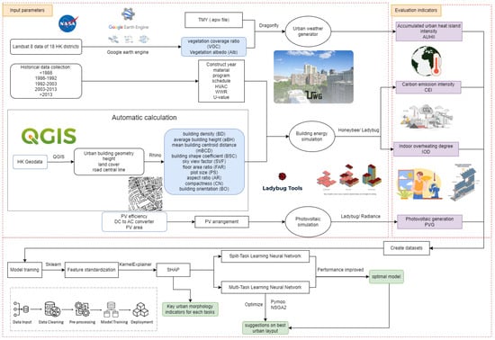 To comprehensively assess the environmental impacts of urban morphology and identify optimized urban form strategies, this study proposes a multi-source analytical framework. As illustrated in Figure 4, the framework integrates four main components: (1) urban morphology data acquisition and processing, (2) multi-dimensional environmental performance simulation, (3) interpretable multi-task learning model development, and (4) multi-objective optimization and clustering analysis. First, 12 key urban morphological parameters, including building density (BD), average building height (aBH), sky view factor (SVF), and vegetation coverage ratio (VCR), were extracted using a parametric modeling workflow built in QGIS [58], Rhino, and Grasshopper [59]. Second, environmental performance indicators were computed using physics-based simulation engines, like Radiance, Dragonfly, and Honeybee. Third, a multi-task learning (MTL) model was developed to predict all four indicators simultaneously, using shared feature representation and task-specific output branches. To enhance interpretability, SHAP (SHapley Additive exPlanations) analysis was applied to quantify the importance and interaction effects of morphological features across tasks. Finally, the trained MTL model was embedded into a NSGA-II multi-objective optimization framework to identify the Pareto-optimal urban form solutions that balance trade-offs among PVG, AUHII, IOD, and CEI. The resulting solutions were then clustered using K-means to extract typical morphological strategies. This integrated workflow enables not only the accurate prediction of performance outcomes but also actionable urban design guidance that aligns energy, thermal comfort, and carbon goals. It is suitable for high-dimensional and complex urban design problems and can find the best trade-off between objectives [60].