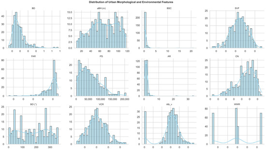 Prior to the development of the machine learning model, all 12 urban form indicators underwent a standardized preprocessing process to ensure consistency, comparability, and model robustness. Figure 5 presents the distributions of standardized urban morphological features used in this study, highlighting variations across the investigated parameters. BD, aBH, and mBCD show relatively balanced distributions, indicating varied urban densities and forms within the dataset. BSC exhibits a highly skewed distribution, predominantly concentrated at lower values, suggesting a preference or prevalence of more compact urban forms in Hong Kong. SVF and VCR distributions are approximately normal, reflecting balanced variations in openness and vegetation coverage within urban environments. FAR and PS demonstrate skewed distributions, implying a higher frequency of densely built-up plots with limited open space. AR, CN, and Alb_v show varying degrees of skewness and multimodality, signifying diverse building layouts, compactness, and vegetation reflectivity levels. Lastly, BO indicates a relatively uniform distribution, illustrating the randomness and diverse directional arrangements of buildings in Hong Kong. For indicators that presented significant skewness, log1p transformation was selectively applied to reduce the skewness and stabilize the variance.
