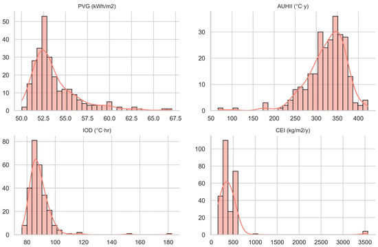 The distribution of target values obtained by simulation is shown in Figure 6. Specifically, PVG exhibited a relatively balanced and interpretable distribution, and thus no transformation was applied. In contrast, AUHII demonstrated significant right-skewness and a wide value range, and was therefore transformed using a logarithmic function to improve linearity and reduce variance. For IOD and CEI, a log1p transformation was employed to handle potential zero or near-zero values while addressing their skewed distributions. This allowed for better convergence and prediction accuracy during training. Additionally, all input features were standardized using MinMaxScaler to normalize their values between 0 and 1, facilitating consistent learning dynamics across different scales. These findings validate simulation outputs that are reasonable and consistent with peer-reviewed results under similar subtropical, high-density urban settings. The value ranges obtained in this study are consistent with those reported by Bian et al. [51], who found an average PVG of 54.27 kWh/m2 and mean AUHII of 263.8 °C·h in Hong Kong’s high-density districts, validating the reliability of the simulation outputs.
