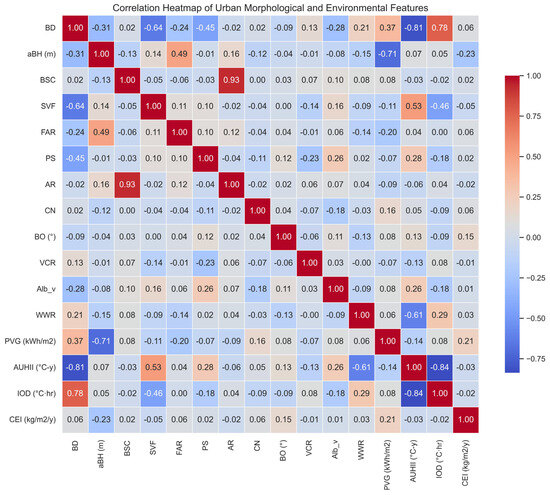 Urban morphology plays a pivotal role in shaping the environmental performance of built environments. Specifically, indicators such as aBH, SVF, and BO directly influence solar exposure and shading patterns, thereby affecting PVG. Parameters including BD, mBCD, and VCR are closely linked to urban ventilation and thermal accumulation, exerting substantial influence on the outdoor microclimate and thus on AUHII. For indoor thermal comfort, variables like PS, BSC, and AR regulate the spacing and form of buildings, which impact solar penetration, heat retention, and cooling loads—key determinants of IOD. In terms of CEI, the indicators FAR, CN, and Alb_v reflect the overall spatial intensity, thermal inertia, and reflectivity of urban materials, which together influence both operational energy demand and environmental load.