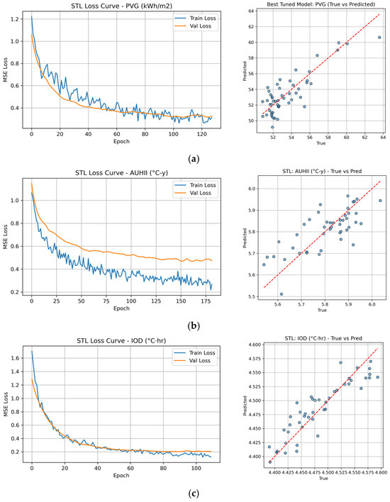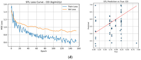 STL model performance for four targets: (a) PVG, (b) AUHII, (c) IOD, (d) CEI. Each subplot shows the training/validation loss curve (left) and predicted vs. true values (right). (The red dashed line indicates the 1:1 line between predicted and true values.)