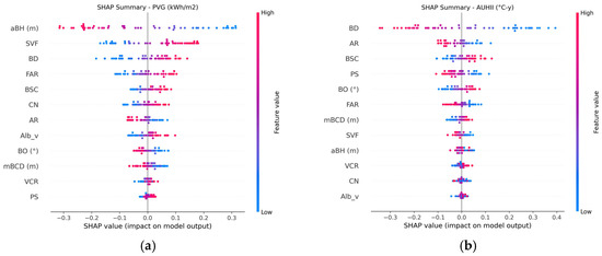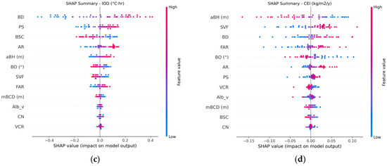 Although the MTL framework demonstrated improved predictive accuracy by leveraging shared information across tasks, the inherent complexity and black-box nature of deep learning models necessitate further exploration to ensure transparency and explainability [61]. To address this, Shapley Additive exPlanations (SHAP) were employed to quantify the contribution of each morphological feature to the predicted outcomes. Figure 10 provides the SHAP feature importance and summary plots for all four sustainability targets: PVG, AUHII, IOD, and CEI. For PVG (Figure 10a), aBH emerges as the most influential factor, followed by SVF and BD. The SHAP summary plot indicates that higher aBH values are associated with lower PVG due to shading or reduced roof exposure, while higher SVF values positively impact PVG, supporting better solar access. For AUHII (Figure 10b), BD dominates the influence, strongly increasing urban heat accumulation, followed by AR and BSC. High AR and BSC tend to exacerbate heat intensity, reflecting the effect of dense, compact environments on thermal buildup. For IOD (Figure 10c), BD again plays a decisive role, reinforcing its cross-domain impact on both outdoor and indoor thermal conditions. Additionally, PS and BSC significantly influence IOD, where higher PS and more compact forms (lower BSC) are associated with reduced indoor overheating. For CEI (Figure 10d), aBH is the most critical feature, with taller buildings generally associated with lower emissions, likely due to vertical efficiency in cooling/heating loads. BD, SVF, and FAR also contribute meaningfully, revealing how dense development, solar exposure, and built intensity shape operational energy emissions. Overall, these SHAP results show both convergences and conflicts across the four targets. BD consistently ranks as a high-impact factor across AUHII, IOD, and CEI, while aBH is critical to both PVG and CEI. This analysis highlights the trade-offs embedded in urban form: for instance, increasing building height may boost PV performance but reduce thermal emissions, whereas increasing BD may raise AUHII and IOD.