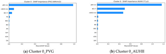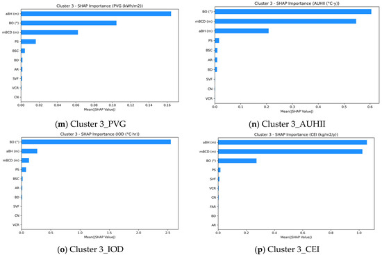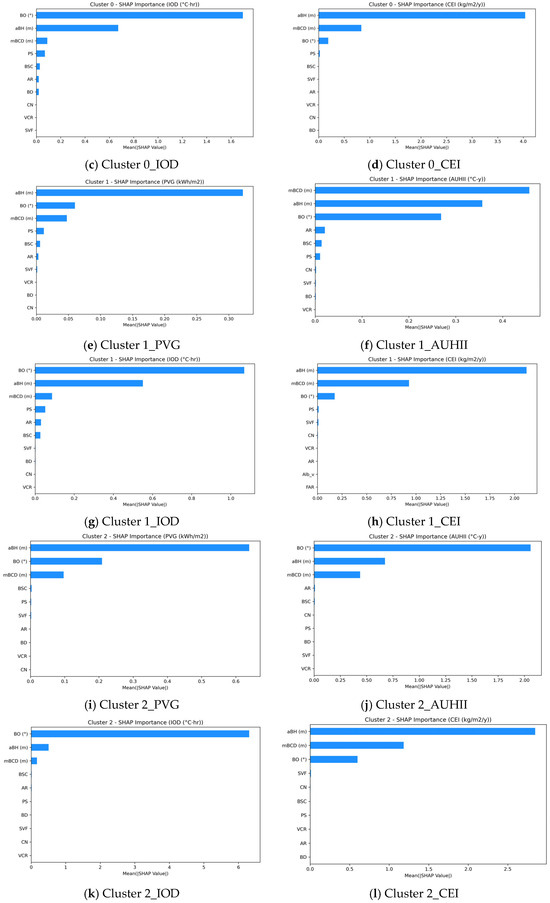Figure 11 illustrates the cluster-wise SHAP analysis across four sustainability objectives (PVG, AUHII, IOD, CEI). Across all four clusters, several consistent trends emerge. aBH is the dominant variable influencing PVG in every cluster, reflecting its critical role in determining solar access across urban forms. Similarly, aBH and BO are repeatedly identified as key drivers for AUHII and IOD, although their directional impacts differ—high aBH tends to improve PVG and reduce CEI, but may increase AUHII in some configurations. Cluster 0 emphasizes a strong dependence on aBH, BO, and mBCD, suggesting a form type characterized by vertical expansion and regular spacing. Cluster 1 shows a similar pattern but places greater weight on BO for IOD, indicating sensitivity to solar exposure angles. Cluster 2 exhibits a shift, where BO becomes the dominant driver for both AUHII and IOD, reinforcing the importance of directional control and spacing (mBCD) in compact layouts. Meanwhile, Cluster 3 is defined by the strong and sometimes extreme influence of BO on IOD and AUHII.