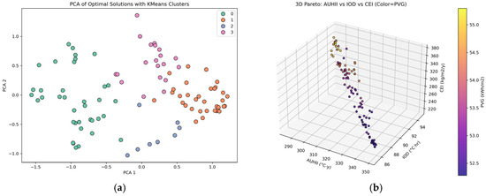 Visualization of Pareto-optimal solutions under different clusters. (a) PCA projection of Pareto-optimal solutions for visualization only: points represent individual solutions, colored by K-means cluster labels. (b) 3D Pareto plot showing trade-offs among AUHII (x-axis), IOD (y-axis), and CEI (z-axis), with marker colors representing PVG values; each point corresponds to one optimal solution.