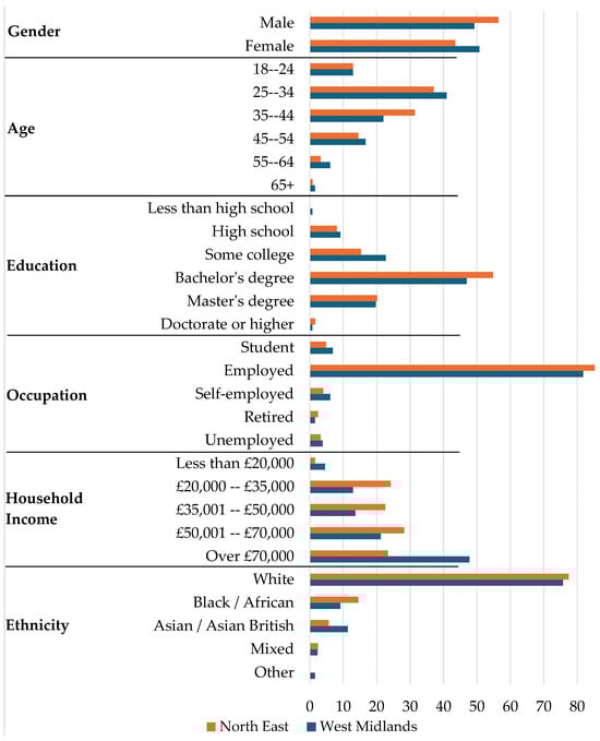 Figure 1 compares the North East and West Midlands regions in terms of demographics, education, occupation, income, and ethnicity. The main findings draw attention to both disparate geographical spread and similar trends. Each area has marginally more men than women, indicating a fairly balanced gender ratio, with females: 49–51% and males: 49–51% for the West Midlands and North East, respectively. Most people are between the ages of 25 and 34 years (41%) and 35 and 44 years (23%), indicating a sizeable working-age population. This implies that a sizeable fraction of the population in both areas is probably economically active. Only about 13% of the population is in the youngest age group (18–24 years), suggesting that there are fewer young adults, perhaps because they cycle and walk more actively due to migration for work or study. Additionally, the population is primarily concentrated in the middle age range, as evidenced by the lowest representation of older persons aged 55–64 years (6%) and 65+ years (1–2%).