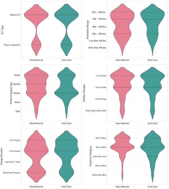 To ensure the validity of the study sample, a Chi-square contingency test was conducted to compare the sample demographics with the population data of the Northeast and West Midlands regions. The test results indicated that, in terms of gender, the sample was representative of the regional population. However, age distribution analysis revealed that participation numbers for individuals over 55 were lower than expected based on the population data of both regions. This discrepancy may be attributed to lower engagement among older individuals in online surveys, as found in studies examining digital survey participation rates across different age groups. Recent studies confirm this age-related trend: Bosehans et al. [46] explored digital and behavioural barriers among older EV users; Rogers [24] explained these patterns using the diffusion of innovation theory; and Smith et al. [25] empirically demonstrated lower EV adoption rates among individuals aged 55 and over.