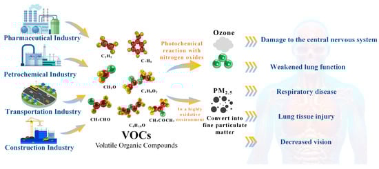 Volatile organic compounds (VOCs) are a significant component of atmospheric pollution [1], as illustrated in Figure 1. With the rapid advancement of industrial activities, substantial amounts of VOCs are released into the atmosphere. Under sunlight, VOCs undergo photochemical reactions with nitrogen oxides (NOx), resulting in the formation of ozone [2]. Ozone poses considerable risks to both plant life and human health [3]. Elevated concentrations of ozone not only inhibit plant growth and diminish crop yields but also inflict severe damage on forest ecosystems. Furthermore, VOCs contribute to the formation of secondary organic aerosols (SOAs) through chemical reactions, which serve as key precursors to PM2.5 [4,5]. When VOCs and their oxidation products deposit onto soil and water bodies, they disrupt the structure of soil microbial communities and disturb the balance of aquatic ecosystems, thereby threatening ecosystem stability and biodiversity [6]. Consequently, enhancing the management of VOC emissions has emerged as a critical priority in contemporary air pollution control initiatives [7].
