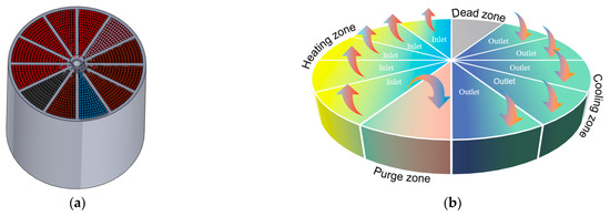 The rotary RTO comprises three primary components: a ceramic heat exchange media, an oxidation chamber, and a rotary distribution valve. The furnace assembly is segmented into twelve distinct zones, consisting of five heating zones, five cooling zones, one purging zone, and one dead zone (illustrated in Figure 5). The rotary distribution valve, driven by a motor at a constant speed, facilitates the seamless transition of waste gas streams between zones, thereby minimizing pressure fluctuations and optimizing energy efficiency. The process begins as waste gases are introduced into the RTO via the main fan, where they traverse through the heating zones for thermal preconditioning before entering the oxidation chamber for high-temperature decomposition. Subsequently, the treated gases are temporarily retained in the cooling zones prior to atmospheric discharge. The thermal energy accumulated in the ceramic heat exchange media is utilized for preheating in the subsequent operational cycles, while a dedicated purge fan introduces clean gas to perform chamber cleaning operations, redirecting residual waste gases to the oxidation chamber for complete decomposition.