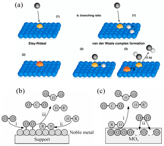 (a) Eley–Rideal, (c) Langmuir–Hinshelwood, and (b) Mars–van Krevelen [48,49].