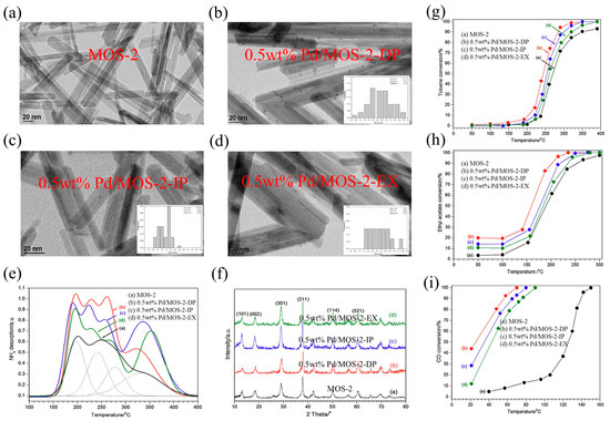 The TEM images and Pd particle size distributions for MOS–2, 0.5 wt% Pd/OMS–2–DP, 0.5 wt% Pd/OMS–2–PI, and 0.5 wt% Pd/OMS–2–EX are shown in Figure (a–d), respectively. Figure (e,f) show the NH3–TPD spectra and XRD characterization of the catalysts. Figure (g–i) show the catalytic performance of the catalyst samples for the oxidation of toluene, ethyl acetate, and carbon monoxide, respectively [56].