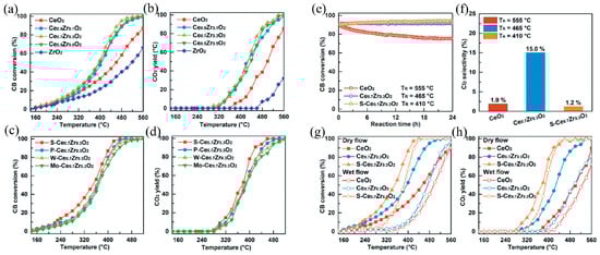 Lv et al. [78] synthesized a series of M-Ce0.7Zr0.3O2 catalysts (M = S, P, Mo) by introducing Lewis and Brønsted acid sites onto the surface of a 3D-ordered macroporous (3DOM) CeO2 framework. Figure 10 shows the chlorobenzene conversion rate and CO2 yield curves for Ce1−xZrxO2 (Figure 10a,b) and M-Ce0.7Zr0.3O2 (Figure 10c,d). It was found that Ce0.7Zr0.3O2 exhibited the best catalytic activity for the combustion of chlorobenzene.