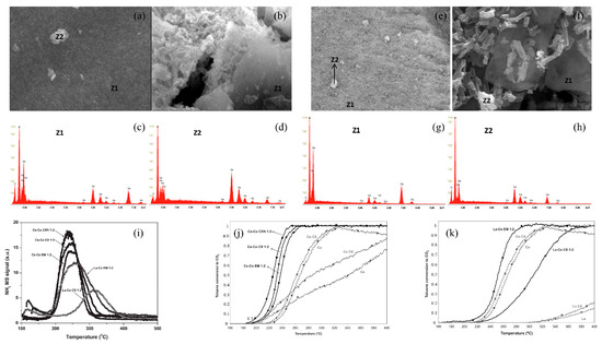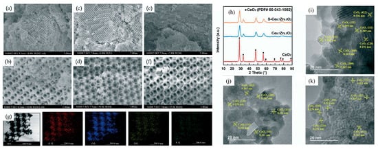 SEM images of CeO2 (a,b), Ce0.7ZrO2 (c,d), and S–Ce0.7Zr0.3O2 (e,f), and the EDS image of S–Ce0.7Zr0.3O2 (g). (h) shows the XRD characterization of the catalyst samples. (i–k) are HRTEM images of CeO2, Ce0.7Zr0.3O2, and S–Ce0.7Zr0.3O2 catalyst samples, respectively [78].