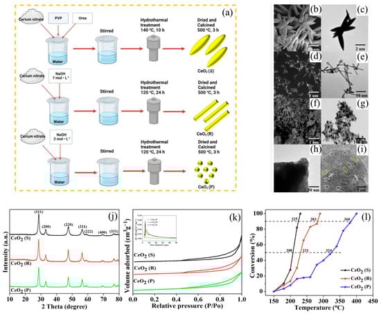 Schematic illustration of the preparation of CeO2(S), CeO2(R), and CeO2(P) (a); SEM and TEM images of CeO2(S) (b,c); SEM and TEM images of CeO2(R) (d,e); SEM and TEM images of CeO2(P) (f,g); HRTEM images of CeO2(S) (h,i); XRD characterization patterns (j); N2 adsorption–desorption isotherms (k); and catalytic performance of the catalysts for toluene conversion (l) [79].