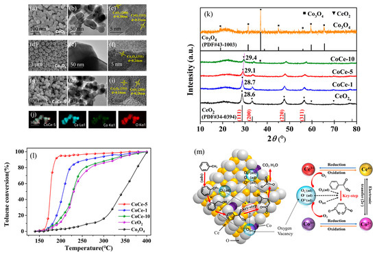 Wang et al. [89] investigated the effects of different Co loadings (1 wt%, 5 wt%, 10 wt%) on the low-temperature catalytic oxidation performance of CoCe bimetallic catalysts for toluene. Characterization using SEM, TEM, HRTEM, and elemental mapping (as shown in Figure 13a–j revealed that the Co species in the CoCe-5 catalyst were highly dispersed, and the morphology was similar to that of CeO2.