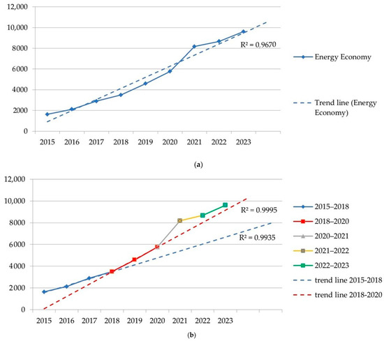 The number of publications in the field of the global energy economy. (a) General view of the trend line. (b) Trend lines in the form of separate sections.