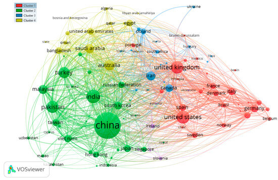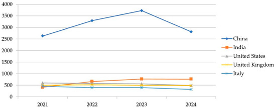 Figure 4 shows that China is the absolute leader in the number of publications. It is followed by countries such as India, the United States, the United Kingdom, and Italy. China is ahead of the other top countries by 2000–2500 publications annually.
