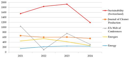 Figure 5 shows the number of publications in the Scopus database in the field of energy economy for the top five leading journals (231,511 search results from 2021 to 2024).