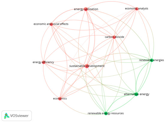 Research Hypothesis 3 was tested using data from 2021 to 2024. At this stage, bibliometric analysis was used for the keywords “econom*” and “energ*”. Bibliometric analysis (qualitative study) was performed based on the search results for scientific publications in the Scopus database from 2021 to 2024 (407,552 search results, https://www.scopus.com/ accessed on 10 December 2024, analysis tool—VOSviewer, version 1.6.19, ©2009–2023 Nees Jan van Eck and Ludo Waltman). The main clusters for the keywords “econom*” and “energ*” were built and analyzed.