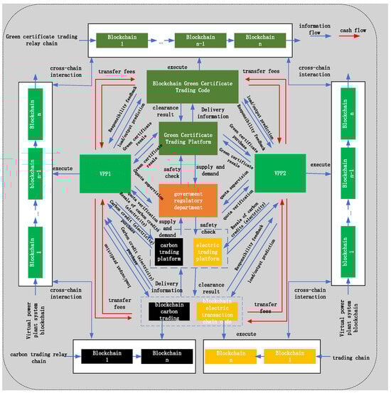 Due to rising global concern about climate change, carbon emission reduction has a broad consensus in the international community [1,2,3]. In the energy field, the traditional power system faces many challenges, such as high carbon emissions, low energy utilization efficiency, and difficulties in the use of new energy sources. Virtual power plant has emerged as an innovative energy management model, which integrates distributed energy resources, energy storage systems, and controllable loads, etc., and is able to achieve flexible regulation and optimal operation of the power system. At the same time, green certificates play an important role in promoting the development and trading of renewable energy as a tool for protecting emerging renewable energy’s environmental rights and interests. The gradual improvement of the carbon emissions trading market also gives the carbon emission reduction index a clear economic value [4]. However, in the current virtual power plant model, the operation process, electricity, carbon, and green certificate-related transactions are often in a decentralized state, and lack an effective synergistic mechanism and a credible trading platform [5,6]. Blockchain technology, with its decentralization, non-tampering, traceability, and other characteristics, provides new ideas and ways to solve the above problems [7]. Constructing a virtual power plant electricity/carbon/green certificate blockchain cross-chain trading platform can achieve the organic integration and efficient interoperability of different types of transactions, improve the transparency and credibility of transactions, and reduce transaction costs and risks. This not only helps to promote the sustainable development of the virtual power plant, but also further promotes the transformation and upgrading of the energy and power industry in the direction of low-carbon and green, which is of great research significance and application value in the process of realizing the global carbon emission reduction target and building a clean and low-carbon energy system.
