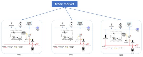 The virtual power plant model of the present invention mainly consists of a carbon capture power plant, a combined heat and power unit (CHP), a new energy generation unit, electric storage, and other devices. Through the carbon capture system, carbon dioxide emissions can be reduced more effectively within the virtual power plant. The structure diagram is shown below. The interaction between virtual power plants is shown in Figure 3.
