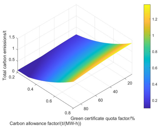 In this subsection, in order to explore the influence of carbon quota coefficient and green certificate quota coefficient on the operation results, the carbon quota coefficient is taken as 0.1~0.8, with a step size of 0.1; the green certificate quota coefficient is taken as 10 percent~90 percent, with a step size of 5 percent, which results in the changes in carbon emissions under different quota coefficients, as shown in Figure 8.