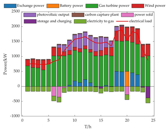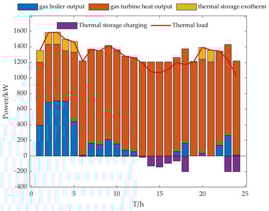 In this paper, the carbon quota coefficient is taken as 0.25, and the green certificate quota coefficient is 80%. The analysis of its operation results is shown in Figure 10. In the 0–5 time period of grid operation, the electricity price is low and the wind turbine generates a large amount of electricity, so the energy storage is charged at this moment, and at this time, the thermal power demand is more gas turbine to provide thermal power, thermal energy storage is discharged, the gas boiler and gas turbine to provide thermal power demand, and in the peak time 6–12 h the system will be sold to gain revenue from the electricity, and at the same time, the electric storage is discharged at this time, and at this time, the thermal storage is discharged. During the peak hours of 6–12, the system sells the power for profit, and the storage is discharged during this time, while the thermal power demand of the virtual plant decreases during this time, and the storage is recharged. During the usual hours 13–16, the electric storage is charged to cope with the arrival of the next peak hour, and during the evening peak hours 17–22, the electric storage is discharged to support the power, while the thermal demand is constantly having more thermal storage for heat discharge. The power and heat power balance operation diagram is shown in Figure 10 and Figure 11.