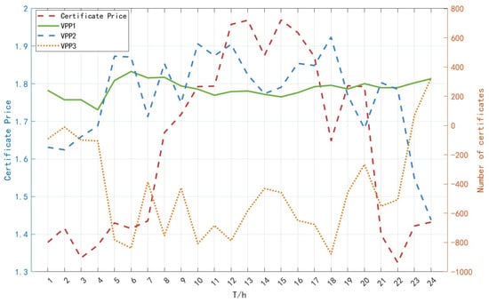 As shown in Figure 14, the price of green certificates is positively correlated with electricity consumption. To increase new energy consumption, virtual power plant 1 and virtual power plant 2, due to the new energy output being less compared to virtual power plant 3 and virtual power plant 1’s new energy output is much smaller than the traditional unit output, so virtual power plant 1 mainly buys from the green certificate market, while virtual power plant 3’s new energy installed capacity is large, which is mainly based on the sale of green certificates.