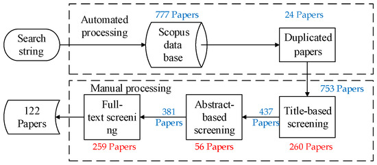 Table 1 displays the final search string alongside its associated domains and terms. This search string underwent an iterative process, wherein the outcomes of each iteration were validated using a test set of 10 pertinent papers supplied by an experienced researcher in power electronics. As a result of the search in the Scopus database, 777 papers were identified and progressed to the next stage, which involved the inclusion and exclusion procedure.