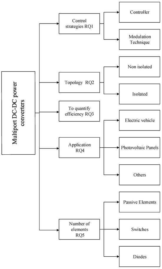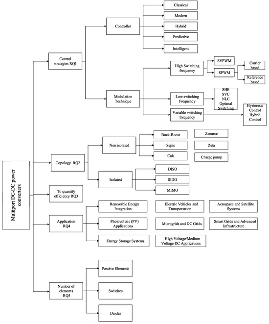 The classification scheme presented is based on available theory and scientific works about multi-port dc/dc power converters. As depicted in Figure 4, this scheme outlines five key research questions addressed in this study. The classification aims to delineate the primary characteristics related to the design, implementation, efficiency, and application of multi-port dc/dc power converters to facilitate replication and performance enhancement.
