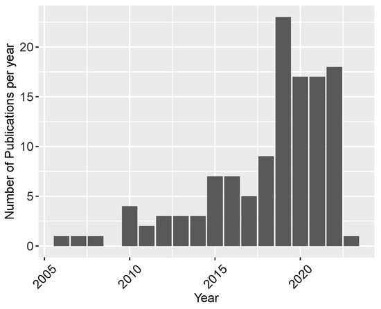 A total of 753 related papers were identified and collected from Scopus. Of these, 437 articles were selected for title-based screening, and 381 articles underwent abstract-based screening. Finally, 122 articles were selected through a comprehensive screening process, and all are listed in Appendix A. Figure 5 shows the number of articles related to the research area published since 2005, highlighting a significant growth rate starting in 2014 and peaking in 2019. This trend may be related to the increasing effects of global warming observed over the years.