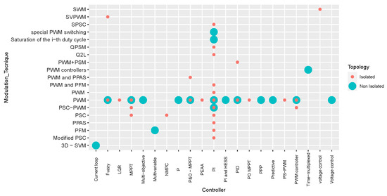 Modern controllers account for approximately 9% of the reported studies between 2015 and 2022. In ID377, the authors recommend the use of the Linear Quadratic Regulator (LQR) method as a more effective approach to determine the gain matrix. LQR is a model-based control strategy designed to minimize a cost function that reflects the performance of the system over time. The multi-objective control algorithm described in ID356 is developed to manage battery operation, direct power flow, select the mode of operation, and determine the appropriate duty cycle in a non-isolated high-gain triple-port dc/dc buck–boost converter. The mode selection and corresponding switching signals are determined on the basis of current photovoltaic (PV) power, the state of charge (SOC) of the battery or its preset current limit, and the load demand. A simple voltage control scheme combined with a Maximum Power Point Tracking (MPPT) technique is used to maintain the output voltage. Additionally, the Partial Power Processing (PPP) scheme proposed in ID2 is based on predictive control. It reduces DC-link current, volume, and power losses by ensuring that most of the energy transfer between low-voltage ports is handled by only a portion of the current in the solid-state transformer, thus improving efficiency.