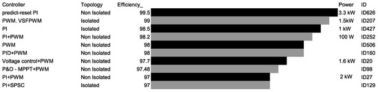 Additionally, a notable work that, although it does not encompass all aspects considered in this study, provides practical conclusions about specific types of power converters. Forouzesh et al. [19] comprehensively review and classify various step-up dc/dc converters based on their characteristics and voltage-boosting techniques. They discuss the advantages and disadvantages of these techniques and the associated converters in detail. Finally, the paper presents and summarizes broad applications of dc–dc converters, including a comparative study of different voltage-boosting techniques.