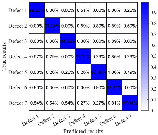 In order to preliminarily test the effectiveness of the electrical equipment defect identification model in this paper, after model training on the dataset, the confusion matrix is used to measure the identification accuracy of the model for each state sample, as shown in Figure 4. The identification accuracy of defects is higher than 97%. This indicates that the image and voiceprint feature joint perception model based on bidirectional coupled attention proposed in this paper has good sensitivity and identification ability for electrical equipment defects.
