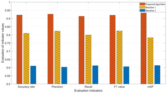 Figure 5 shows the comparison of the defect identification results. Compared with the two baseline algorithms, the accuracy of the proposed algorithm is improved by 12.1% and 33.7%, the precision is increased by 11.3% and 34.3%, the recall rate is increased by 12.5% and 33.1%, the F1 value is increased by 10.4% and 34.1%, and the average accuracy is increased by 16.2 and 34.3%, respectively. The proposed algorithm analyzes the temporal characteristics of image and voiceprint data, and adaptively adjusts the attention weight of the network according to the time interval and correlation. This can strengthen the attention to typical and frequent defects, improving the accuracy of preliminary identification. Additionally, the closed-loop CNN realizes multi-stage iterative optimization by feeding back the results of preliminary identification to the fine diagnosis network. This allows the diagnosis network to carry out detailed and accurate diagnosis for the actual defects in complex environments, improving robustness and accuracy.