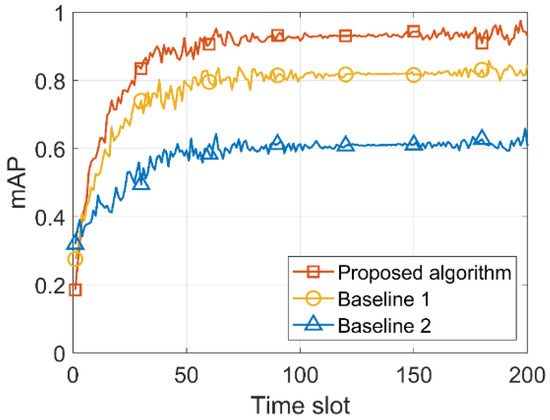 Figure 6 demonstrates the change of mAP versus slots. The average accuracy value of the proposed algorithm rises to about 0.85 in the first 30 slots, and finally stabilizes at 0.931. Baseline 2 shows a slow increase in mAP to 0.6 around 50 training slots, eventually stabilizing at 0.611. Compared with the two baseline algorithms, the convergence speed of the proposed algorithm is increased by 22.92% and 60.42%, respectively. The proposed algorithm uses the vertical self-attention mechanism to explore the intricate relationships within the modality through the multi-head attention mechanism, so that the network can adaptively pay attention to more critical features and improve the model’s perception of complex defects. Horizontal coupling attention introduces cross-modal information interaction, so that the semantic gap between the image and the voiceprint can be effectively bridged. This significantly enhances collaboration between different modalities while improving the efficiency and accuracy of defect identification.
