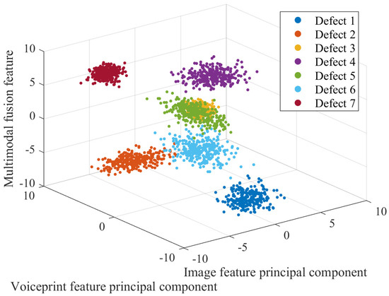 Figure 7 shows the spatial distribution of features after image and voiceprint joint perception and fault feature extraction. The three coordinate axes represent the principal component of the image features, the principal component of the voiceprint feature, and the multi-modal fusion feature, respectively. Each point corresponds to a fault sample, and the fault sample is mapped into the three-dimensional space through principal component analysis to form the feature point. The close aggregation of the feature points means that the discriminative nature of the fault type in the high-dimensional feature space is enhanced, which indicates that the method successfully separates the features of different fault types and achieves high effectiveness and accuracy in the process of feature extraction and fault identification. It is worth noting that defect 4 and defect 7 are not close to the center, which further highlights their distinct characteristics and effective separation from other defects. This is a desirable outcome for accurate fault identification and diagnosis. The vertical self-attention mechanism can mine more complex feature associations within image and voiceprint modalities. The horizontal coupling attention mechanism eliminates the semantic gap between different modalities through the exchange of cross-modal information. This allows the features of image and voiceprint to complement each other, thereby improving the accuracy of defect identification. Through this bidirectional coupled attention mechanism, the model can not only capture the unique characteristics of each modality, but also enhance the synergistic effect between them, so that fault samples of the same type can be tightly clustered together in the feature space. Through the effective fusion of image and voiceprint features, the proposed method successfully extracts the core features of the equipment fault and can effectively map these features to the low-dimensional space. In the samples of the same fault type, the aggregation of feature points indicates that the features of the fault type are strengthened and clearly resolved under the multi-modal information fusion, so as to achieve more efficient fault identification and diagnosis. Compared with the traditional single-modal feature extraction method, the accuracy and robustness of identification are significantly improved. Especially in complex backgrounds and with multi-source interference, the model can maintain strong identification ability through the complementarity of multi-modal features.