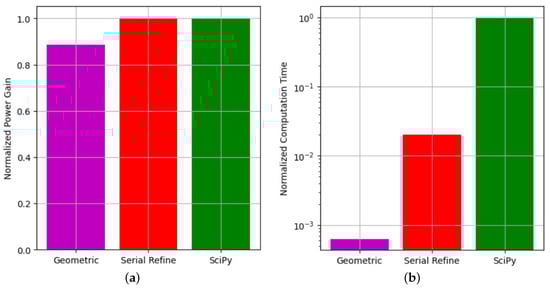 Comparative performance of three yaw optimization algorithms evaluated on a three-turbine wind farm case study (total capacity: 15 MW). Wind directions were swept from to with a resolution of per step. (a) Power gains normalized to SciPy results; (b) computation time normalized to SciPy runtime. Serial-refine offers similar power performance as SciPy with much lower computational cost, while geometric trades power gain for speed.